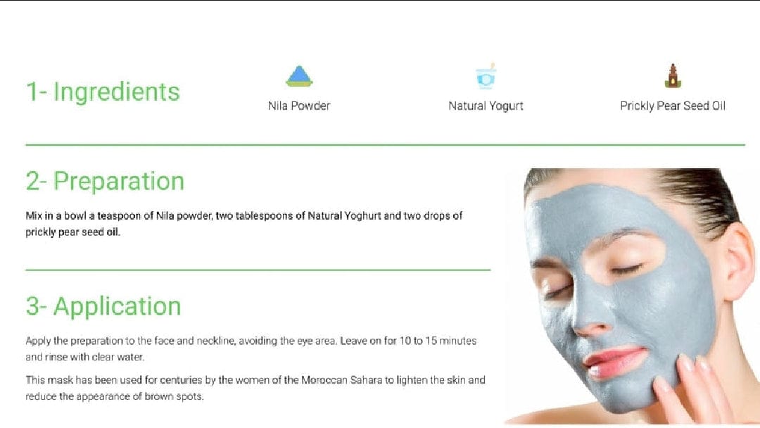 Skin Brightening**: Moroccan Neela Powder is renowned for its ability to brighten the complexion. Regular application can diminish dark spots, hyperpigmentation, and uneven skin tone, leaving the skin looking radiant and